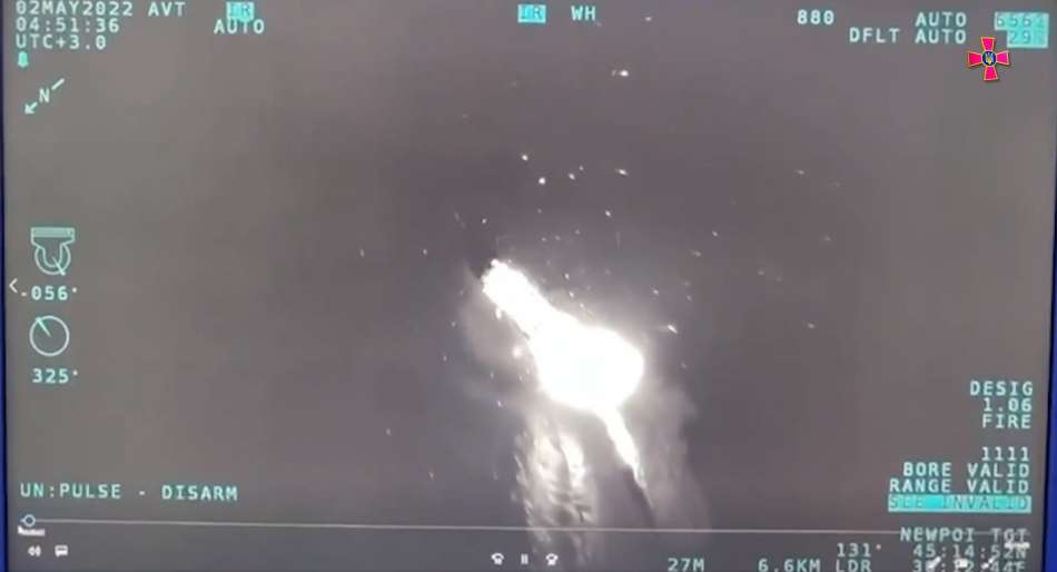 На кадрах видно, як у російські багатоцільові катери типу «Раптор» влучає керований боєприпас, після чого відбувається вибух та починається пожежа на них.